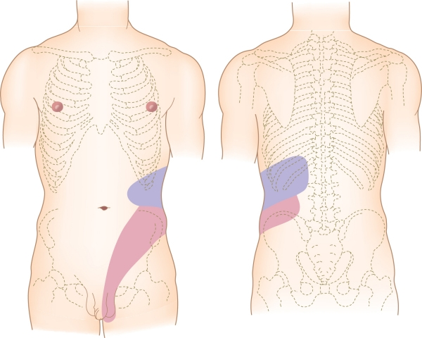 – Vị trí: Đau vùng thắt lưng, sườn lưng, đau lan xuống dưới, ra trước có khi lan ra bộ phận sinh dục ngoài.